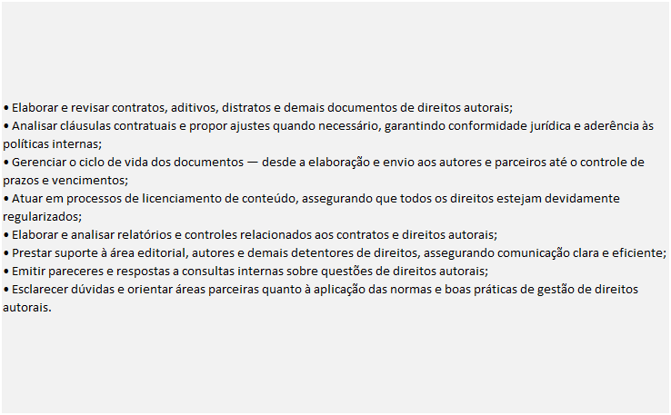 • Experiência anterior com contratos, especialmente voltados a direitos autorais ou editoriais será considerado um diferencial relevante;